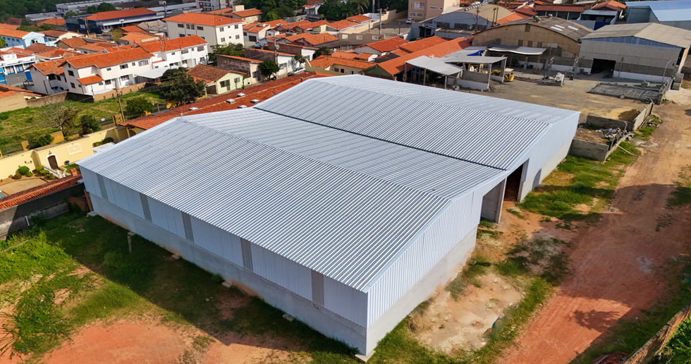 Nesta obra contamos com estruturas metálicas de cobertura e pilares pré-fabricados em concreto armado. Fechamentos da obra, parcial alvenaria rebocada com altura de 3 metros e o restante do fechamento em telhas metálicas com pintura na face externa.